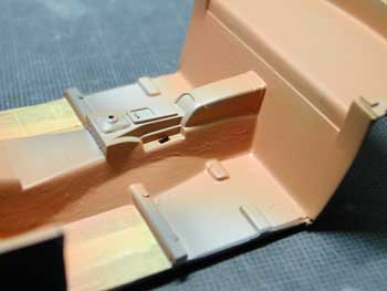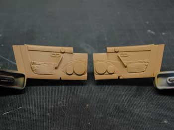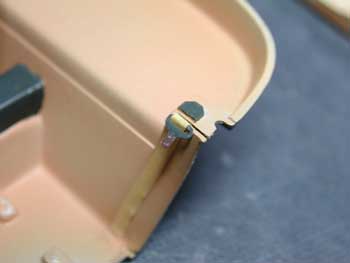 それぞれ塗装したパーツを組んでシャーシを 完成します。 ドアの内張りは隙間対策のため少し外側に 接着します。 |