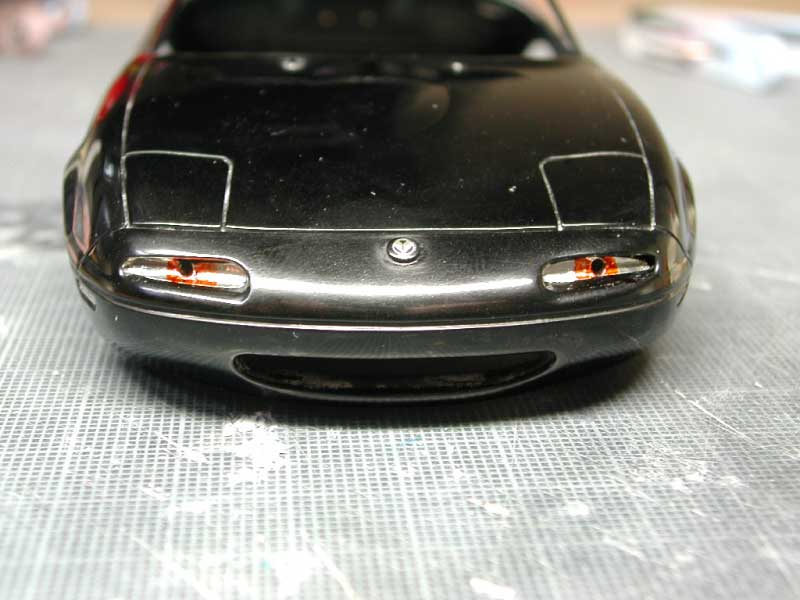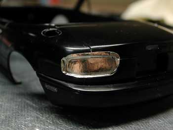 ライトのふちをボディカラーで塗っておきます。 これによってクリアパーツの厚みをカムフラージュします。 |