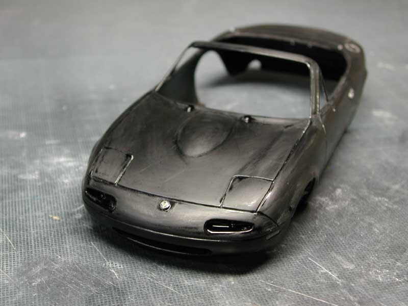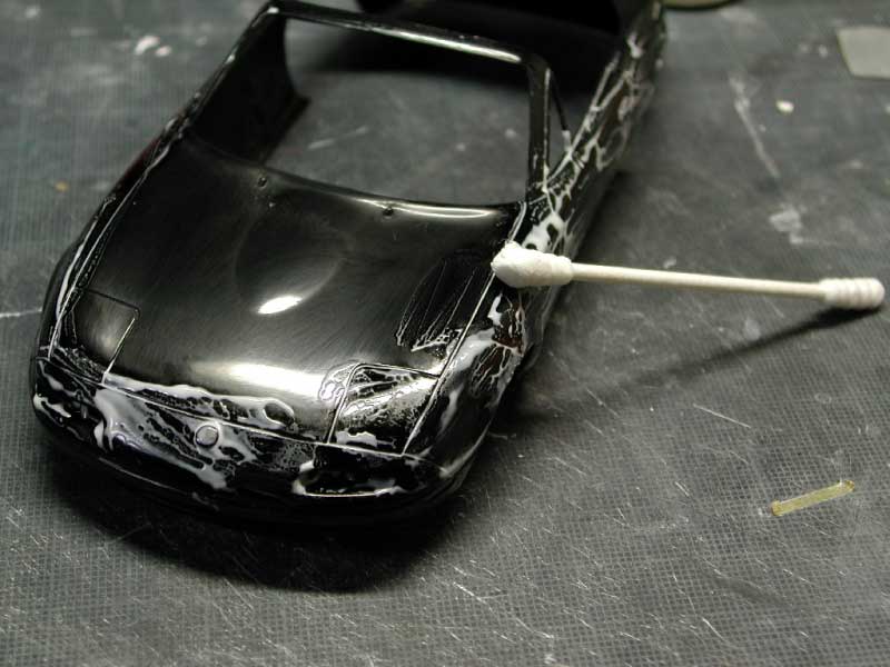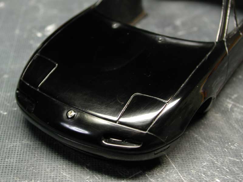 続いてボディですが、うっかり吹きっぱなしの写真を 撮り忘れてしまいました。 画像はペーパーがけを終えた状態です。 カラーはGSIのスーパーブラックを使用してみましたが、 どうスーパーなんだかイマイチ分かりませんでした。 クリア層もそれに習ってスーパークリア II を使ってますが、 こちらは何となくスーパーな感じが分かる仕上がりで、 なにが違うかって、硬いんです。塗膜が。 普段は研ぎ出しといっても2000番のみでやってまして、 実際それで充分なんですが、今回の塗膜は2000番だけでは 研ぎきれない部分があり、1500番→2000番の2段階に なりました。 丈夫になるのはいいんですが、油断して削り過ぎてしまわない よう、注意が必要です。 |