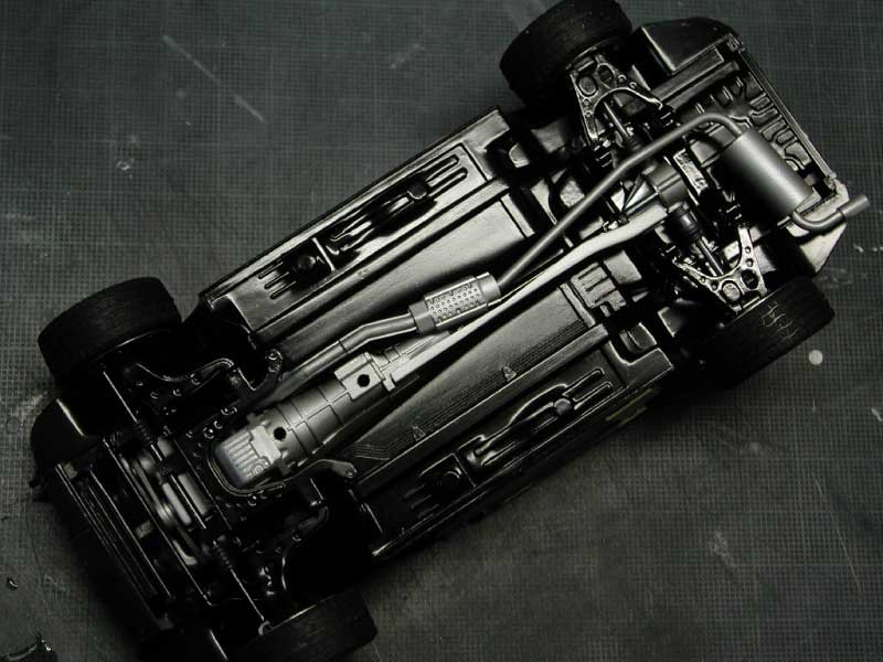 シャーシ裏面。 塗装指示通りに色を塗っただけのノーマルです。 ドライブシャフト付近の二つの穴はディスプレイ ケースに固定するためのものです。 |