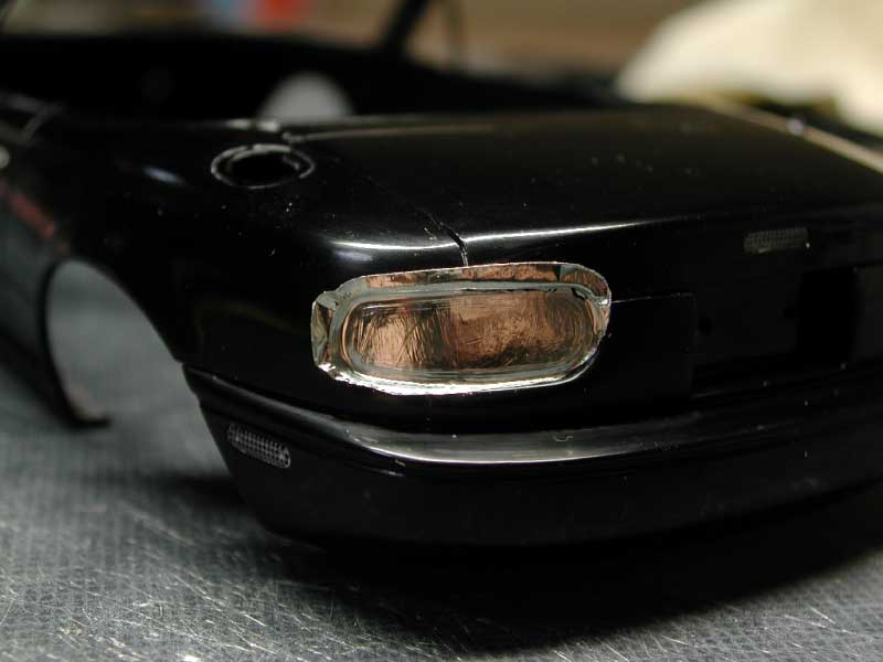 ライト部分には市販の糊つき金属箔、メタルックを 貼り込んで輝きを持たせます。 大きめに切って貼付け、余分を切り取ります。 |