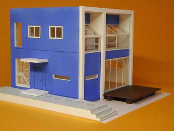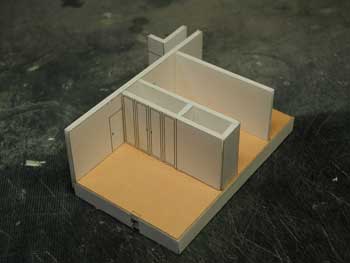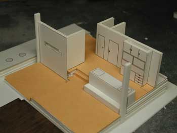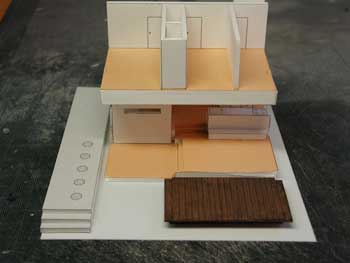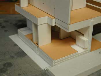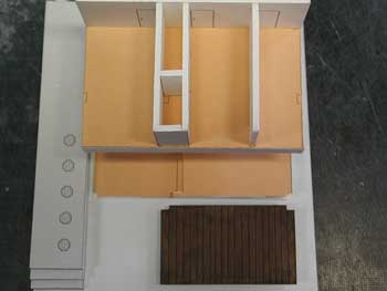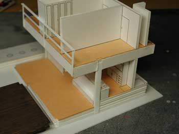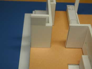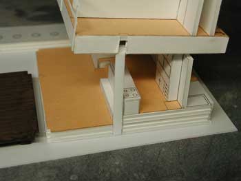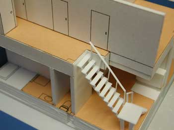 1階天井から2階床までの厚さを再現するためです。細切りしたスチレンボードを組み合わせていきます。 |