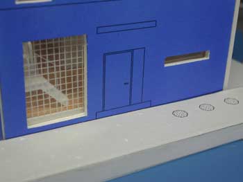 1階の壁に0.3mm厚のプラ板を貼って、薄い壁を2階まで延長します。 |