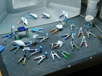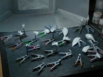 全パーツ白塗り。 塗装中の部品をどう保持するかなんてのはまさしく十人十色でしょうね。 おもしろそうなので出してみました。 ご覧の通り、ボクは洗濯ばさみを多用します。 |