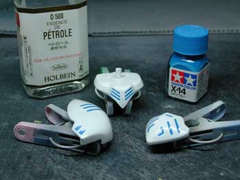 スリットの部分はスカイブルーにします。 エナメル塗料ではみ出しつつ、ゴーカイに塗って はみ出た部分を溶剤で拭き取ります。 写真は油絵の具の溶剤の一つ、ぺトロール。 T社のシンナーは信用してません。 |
