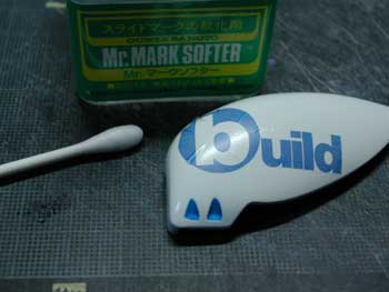 デカールが軟化して伸び、密着してくれます。 自作デカールは特にインクが剥げやすいので、決してゴシゴシ こすらないこと。 真ん中から外に向かって綿棒をそっと転がすようにしてシワを 伸ばし、密着させていきます。 |