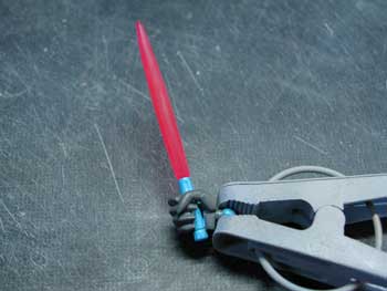元の刃を切り落とし、基部に穴を開けて接続。 1000番のペーパーを掛けっ放しにしてツヤ消しっぽく。 |